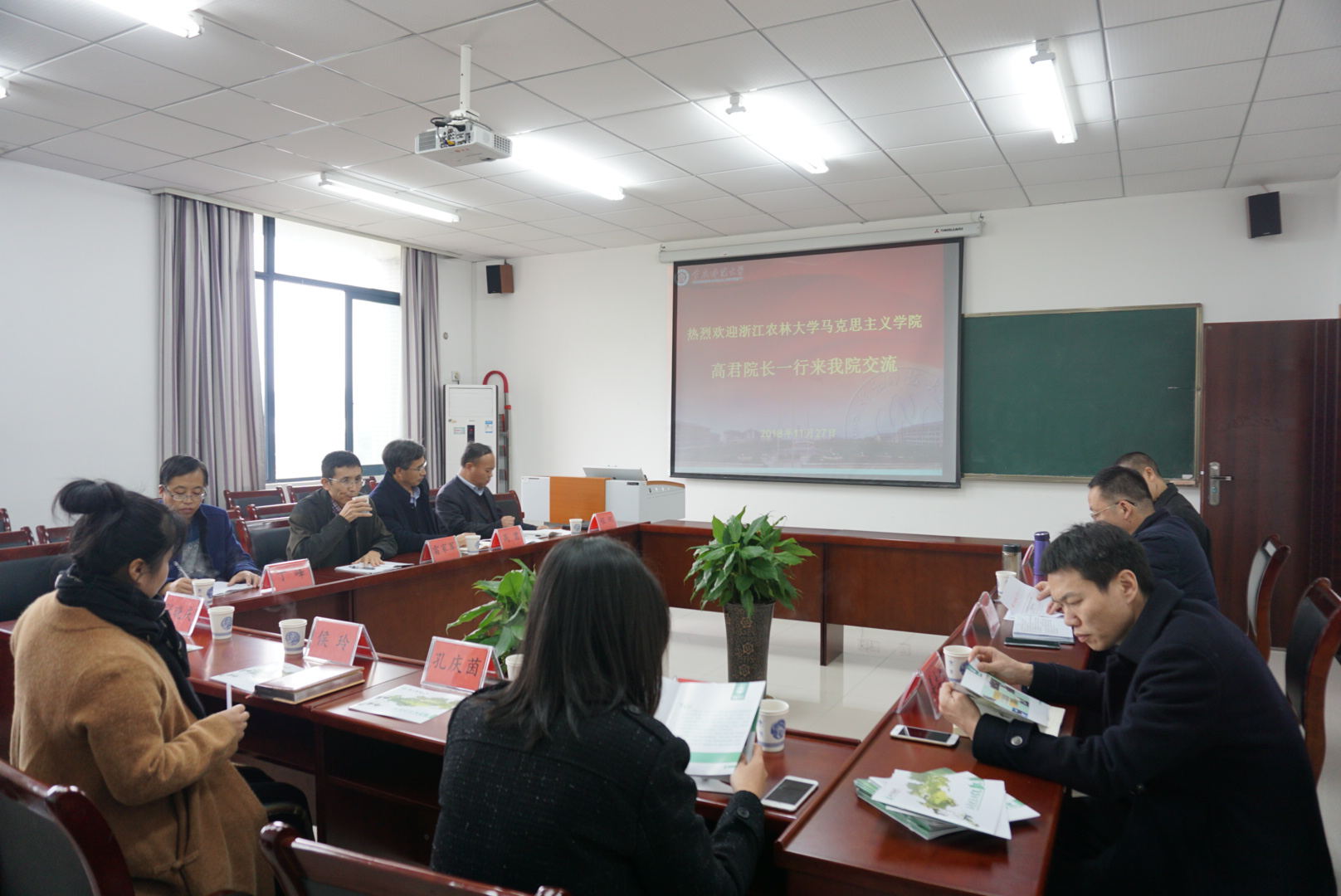 2018年11月27日下午,浙江农林大学澳门金威尼斯游戏院长高君教授,中国近现代史基本问题研究方向负责人雷家军教授,教研室主任丁峰博士、程珂博士一行来我院进行工作交流。我院院长陈洪教授、副院长况明安副教授、党委副书记姜土生副教授、思想政治理论课教研部主任孔庆茵副教授、毛中特教研室主任邵二辉副教授、研究生思想政治理论课教研室主任侯玲副教授、教科办主任张晓庆等参加交流。