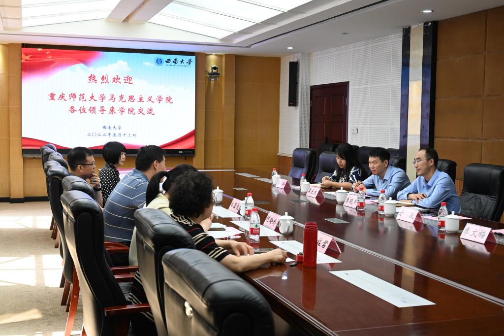 会上,西南大学马院领导围绕学院事业发展,重点介绍了全国重点马院建设、学科建设及队伍建设、马克思主义理论本科专业建设、青年教师队伍培养体系、教学科研及就业激励举措以及学生思想政治工作特色和本研学生就业工作等情况。我院各领导结合自身分管工作内容,适时与对方交流讨论、咨询学院建设发展中的重点、创新点,同时双方领导就学院发展中的共性问题进行了深入的探讨与交流。