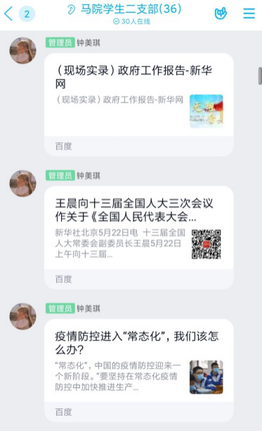 2020年3月5日下午16:20—17:30,中共澳门金威尼斯游戏学生二支部委员会利用网络平台组织召开了支部大会,大会以学习《政府工作报告》、《全国人民代表大会关于建立健全香港特别行政区维护国家安全的法律制度和执行机制的决定(草案)》、常态化疫情防控下重要举措,并交流讨论学习心得为主要内容。