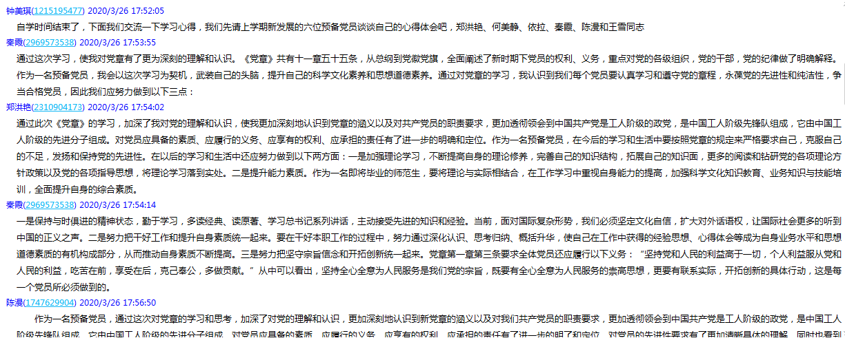 会议之初,由钟美琪组织大家进行线上签到,随即宣布会议开始,并对此次会议主要内容做了说明。会议开始的前30分钟是大家自行学习时间,结合视频材料学习《中国共产党章程》、《2019-2023全国党员教育培训工作规划》。随后大家分享各自的学习心得,分享由上学期新发展的六位预备党员开始,大家结合学习、工作和生活实际展开分享,其中方敏同志说到作为党员要对八项义务和八项权利有清晰的认识。大家畅所欲言,讨论热烈,会议于18:20圆满结束。