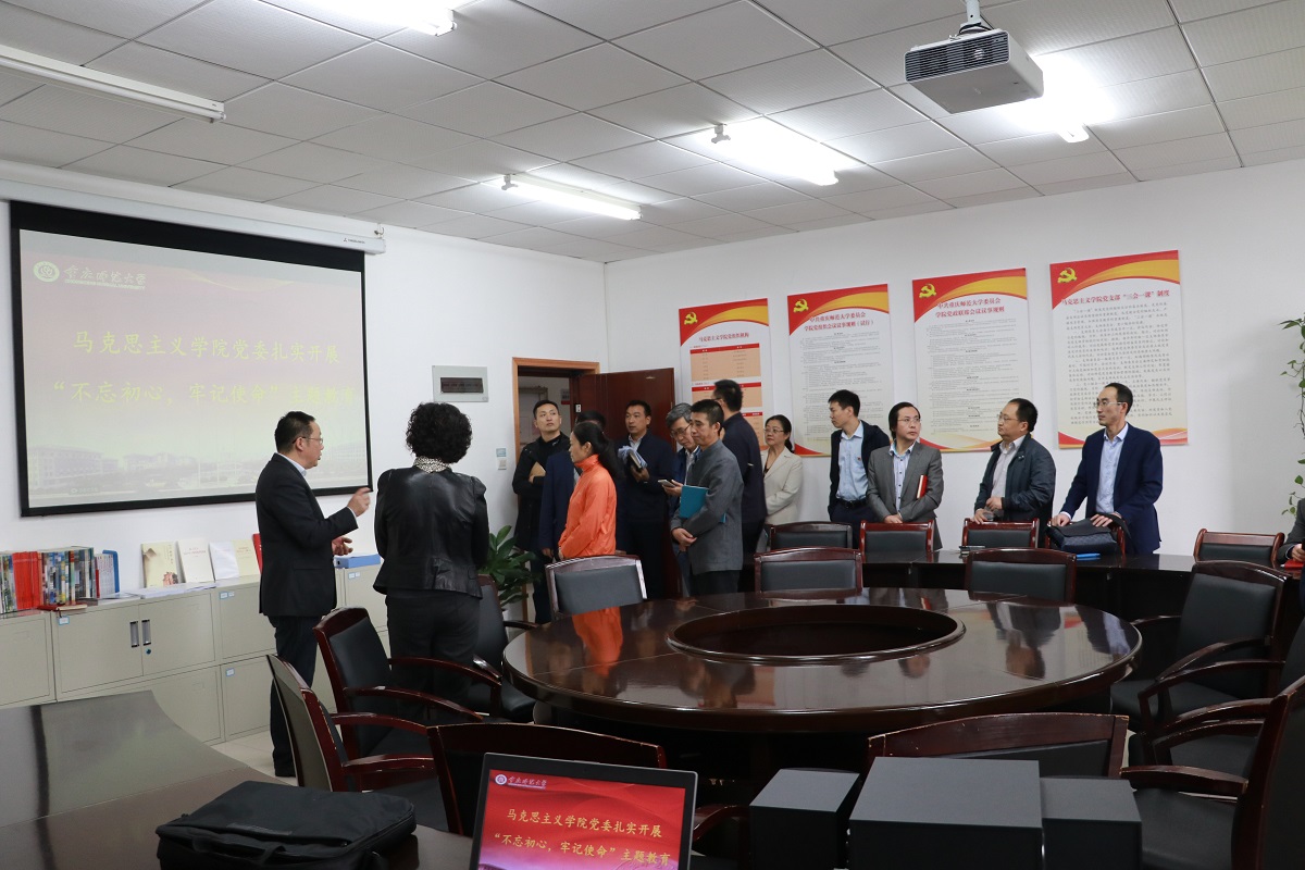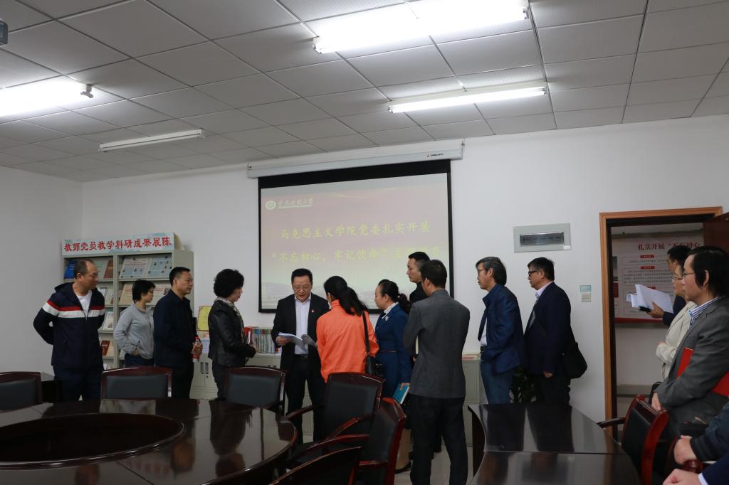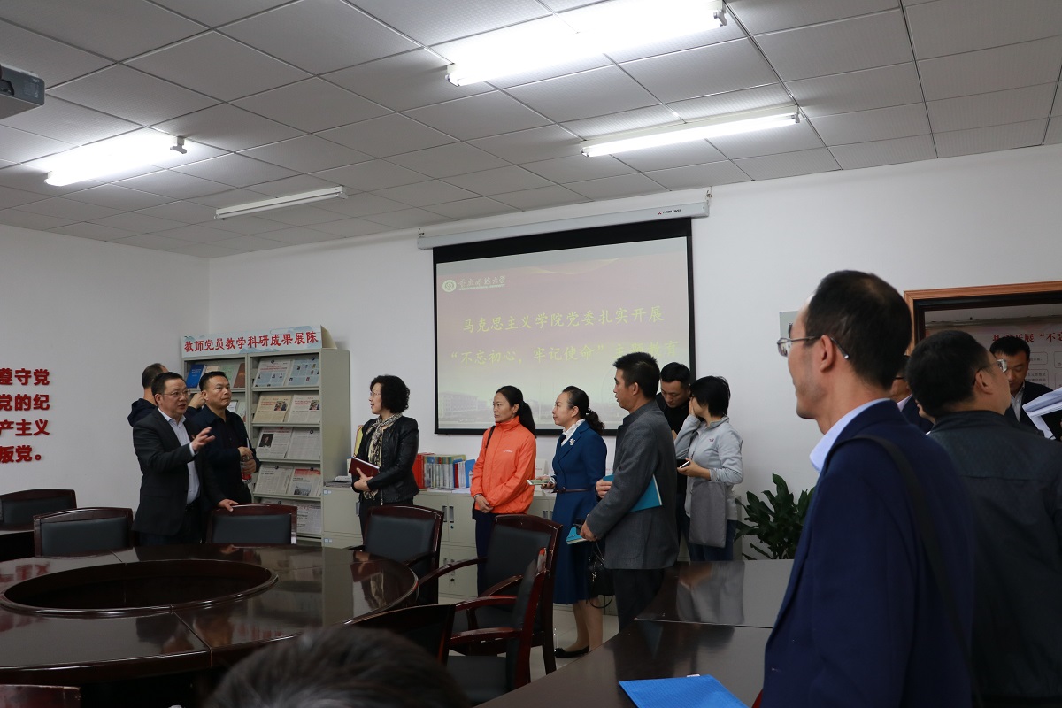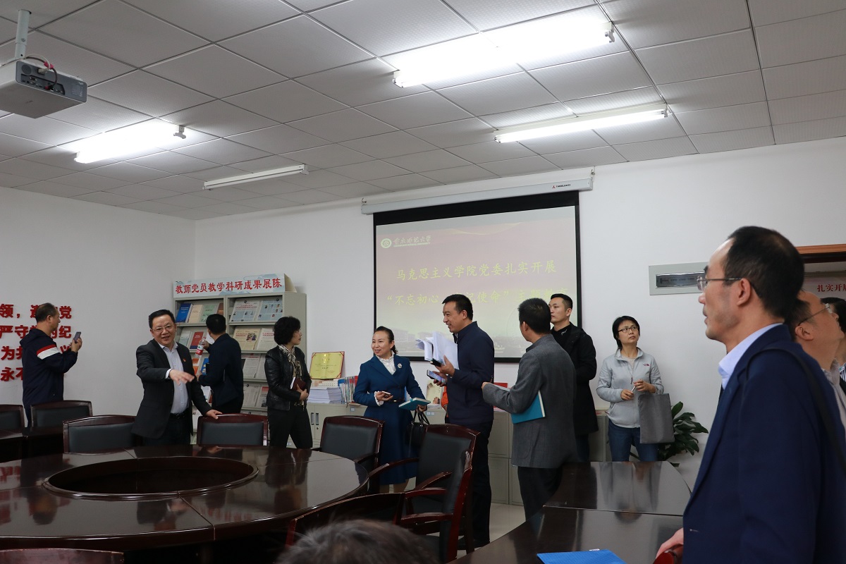 陈洪同志首先向大家介绍了学院主题教育的氛围营造、支部设置以及党员活动室的环境布置,重点介绍了我院开展“不忘初心、牢记使命”主题教育情况。一是提高认识,召开了主题教育动员会,全文学习了习近平总书记在“不忘初心、牢记使命”主题教育工作会上的重要讲话,对开展主题教育提出了明确要求,提高党员对主题教育重要性的认识;二是细化方案,学院党委制定了主题教育工作方案,并召开支部书记工作会作了专门布置;三是学习打头,把学习特别是把学习习近平新时代中国特色社会主义思想贯彻始终,学习中采取“轮讲制”,每位干部和党员都要领学和讲解,同时将通读与精读、研学与研究、宣传与宣讲、问道与问心、解惑与解决结合起来,确保学习的效果;四是同步推进,将学习与检视问题、调查研究、整改落实同步开展;五是强化载体,以“七个一”活动深化主题教育,即参加一次“升国旗仪式”、参与一场主题迎新晚会、进行一次党课宣讲、组织一次主题党日(团日、班会)、接受一次革命传统教育、组织一次观影活动、接受一次先进典型或警示教育;六是推动发展,将主题教育与推进重点澳门金威尼斯游戏建设、一流专业建设、深化思想政治理论课改革、提升人才培养质量等紧密结合起来。