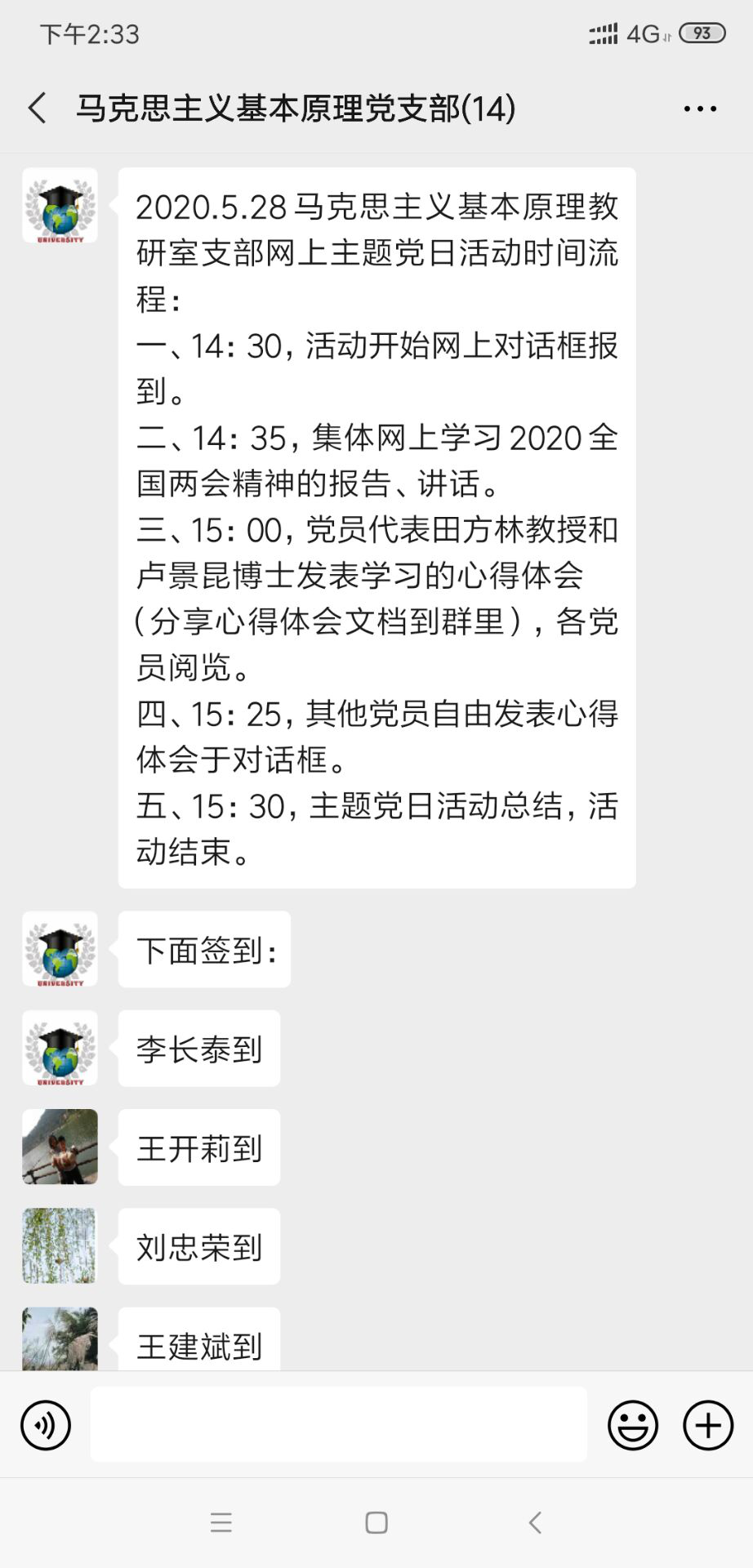 2020年5月28日,我院马克思主义基本原理概论教研室支部下午在微信支部群中开展了以学习贯彻2020年全国“两会”精神主题党日活动,马基原教研室党支部全体党员参加会议。