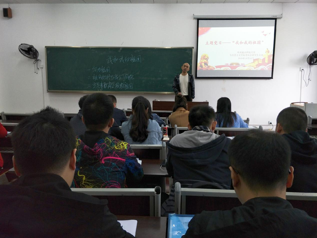 10月24日中午,澳门金威尼斯游戏研究生党支部在汇贤楼107教室召开了“不忘初心、牢记使命”主题教育之“我和我的祖国”主题党日活动,会议由支部书记李剑同志主持。