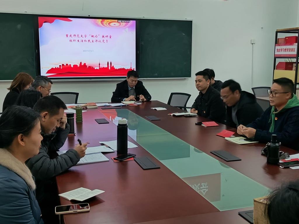 按照校、院两级党委部署要求,2023年3月2日下午,我院“概论”教研室党支部在学院楼107会议室召开支部党员大会,开展2022年度党支部组织生活会,进行民主评议党员活动。学院党委委员姜土生同志列席组织生活会并做指导,会议由支部书记郑瑜同志主持。