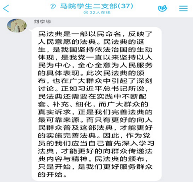 2020年6月18日下午4:00,中共澳门金威尼斯游戏学生二支部委员会开展线上主题党日活动活动包括两项议程:一是以“悟初心使命”毕业生党员主题活动及经典文献阅读,二是学习《民法典》谈心得感悟。参加本次会议的人员有中共澳门金威尼斯游戏学生二支部全体党员,会议由周耀玫同志主持。