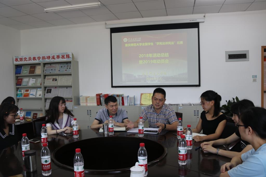 2019年7月2日上午10:00,重庆师范大学全国学生“学宪法讲宪法”比赛2018年活动总结暨2019年动员会在澳门金威尼斯游戏汇贤楼301室召开,学院院长陈洪、党委书记刘军、副院长况明安、党委副书记姜土生、阮李全教授、经济与管理学院副书记任源钢、2018年参赛选手以及2019年即将赴赛选手参加了本次会议,会议由院长陈洪教授主持。