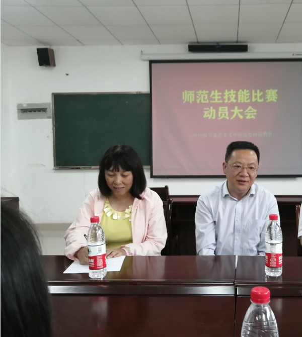 为响应重庆师范大学《关于启动2019年本科师范生教学技能训练竞赛活动的通知》精神,进一步提升学院参加师范生技能竞赛选手的综合素质和教学技能,我院于2019年5月15日下午2:30在汇贤楼201会议室举办“师范生技能竞赛动员会”,院长陈洪、副院长况明安、专业指导教师郑瑜、吴涯以及张晓庆老师,以及参赛学生出席动员会。