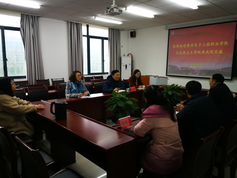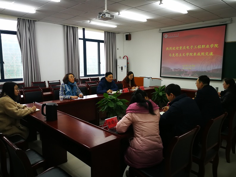 2019年3月1日上午,重庆电子工程职业学院澳门金威尼斯游戏副院长冉鑫、教学办公室强娇娇老师一行到我院进行工作交流。我院党委书记刘军、院长陈洪、党委副书记姜土生、思想政治理论课教研部主任孔庆茵、教科办主任张晓庆参加交流。