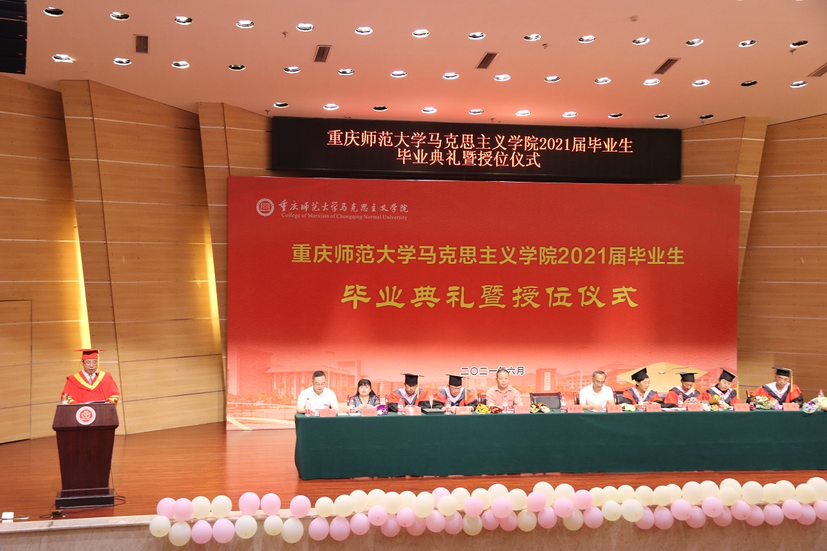 昔日同窗数载共同进步,今日挥手道别各奔前程。2021年6月22日14时30分,学院2021届毕业生毕业典礼暨授位仪式于校友会堂音乐厅隆重举行。重庆师范大学校长兼学院院长孟东方,学院党委书记刘军、党委副书记方敏、副院长况明安,学院学位委员会主席陈洪,委员柯佳敏、祝玉峰、田方林、侯玲、李剑出席本次典礼,学院全体教师、全体本科毕业生、低年级学生代表、学生会全体成员积极参与。学院党委副书记方敏主持大会。