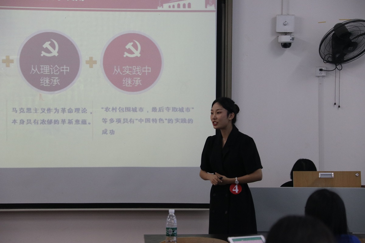紧接着,各位选手依次进行经典阅读展示。3号选手张雯棋以《觉醒年代》的台词引入,全面阐述经典著作《改造我们的学习》。张雯棋首先阐述了《改造我们的学习》的写作背景,随后介绍文章内容,并着重向大家分析了文章深厚内涵。她指出作为青年大学生应积极“改造我们的学习”,去寻找自己真正的价值,不忘初心、不负时光;4号选手罗茂渝从作者简介、写作背景、内容概要、阅读心得与思考四个方面对《建设有中国特色的社会主义》进行汇报,她将全文凝练一字为“闯”,从“敢闯”和“善闯”两点阐述以邓小平为代表的新一代领导人在实现国家强大愿景的道路上所面临的困难和解决路径。最后指出新时代新青年应继承敢闯的勇气,发扬善闯的能力,为实现中华民族伟大复兴的中国梦奉献自己的力量。