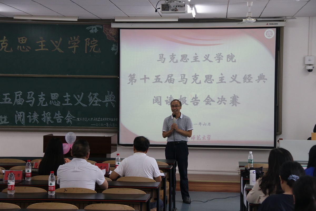 为深入学习贯彻习近平总书记在党史学习教育动员大会上的重要讲话精神,推进党史学习教育向纵深发展,提高青年学生专业素质和理论水平,2021年6月28日14时30分,学院特于砺志楼2208教室举办马克思主义经典阅读报告会比赛决赛。此次报告会特邀学院党委书记刘军、党委副书记方敏、副院长况明安为嘉宾;特邀田方林、刘忠荣、李剑、王建斌四位老师担任评委。学院2020级全体学生到场观摩学习。