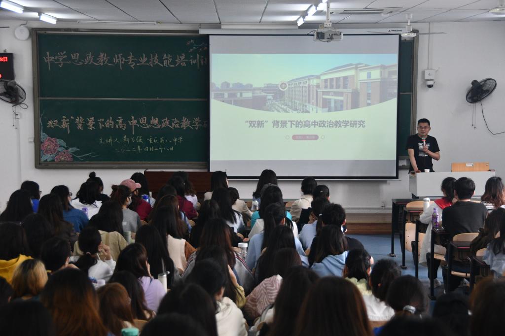 为提高我院学子师范生综合素质,进一步提升中学教师队伍的综合素养,培养有理想信念、有道德情操、有扎实学识、有仁爱之心的“四有”好老师,2022年4月28日上午10时30分,我院特邀重庆市第八中学校政治教研组组长、中学政治高级教师靳万强老师,于砺志楼2409教室开展“双新”背景下的高中思想政治教学研究——中学思政教师教育教学素质培养主题讲座,2020级思想政治教育专业全体本科生参加,我院思想政治教育系副主任郑瑜主持。