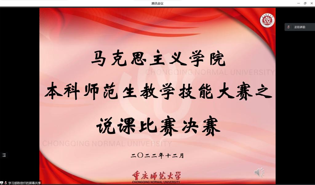 百年大计,教育为本;教育大计,教师为本。为提升我院师范生教育技能、帮助学生掌握说课授课能力,2022年12月15日14时30分,学院通过线上方式举行本科师范生教学技能大赛之说课比赛决赛。本次比赛特邀我院郑瑜副教授、吴涯副教授与向眉老师担任评委。
